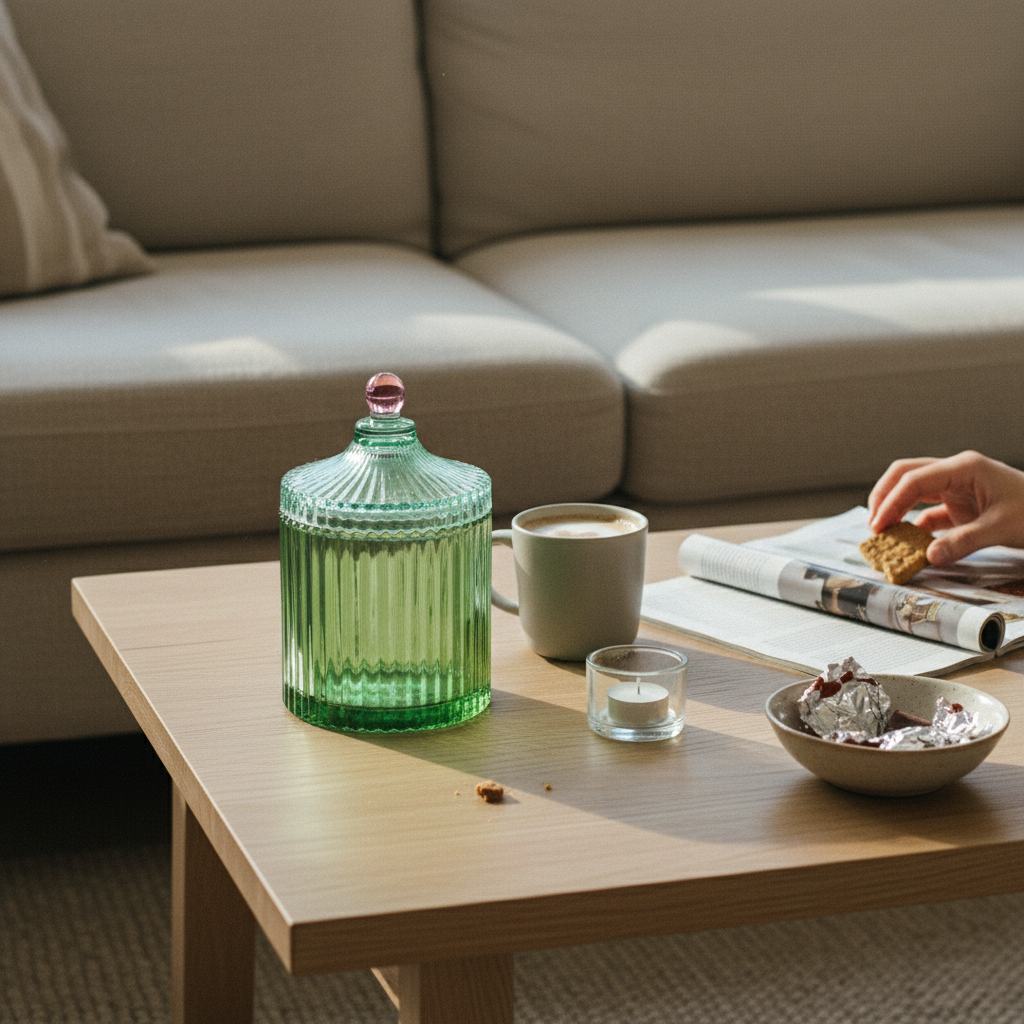 Bonboniér skvěle funguje jako odkládací schránka na drobnosti nebo jako čistě dekorativní prvek na polici. Svěží zelené a mátové barevné pruhy dodají vašemu interiéru lehký a letní vzhled.