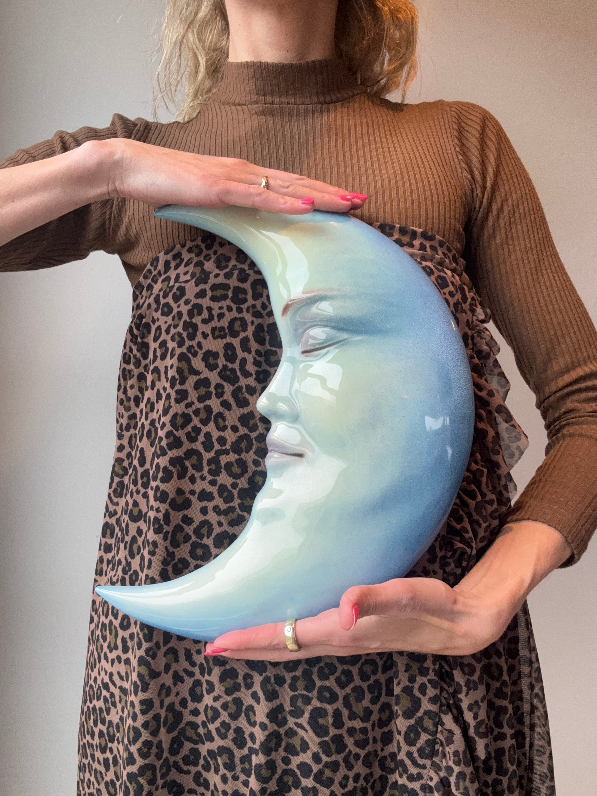 Tento modrý nástěnný závěs je vyroben z italské keramiky rodinnou firmou. Charakteristický design se spícím obličejem dodává nástěnné dekoraci rozmarný výraz s jemnými detaily. Závěs na stěnu je k dispozici ve třech různých velikostech: malá (16 cm), střední (27 cm) a velká (36 cm).