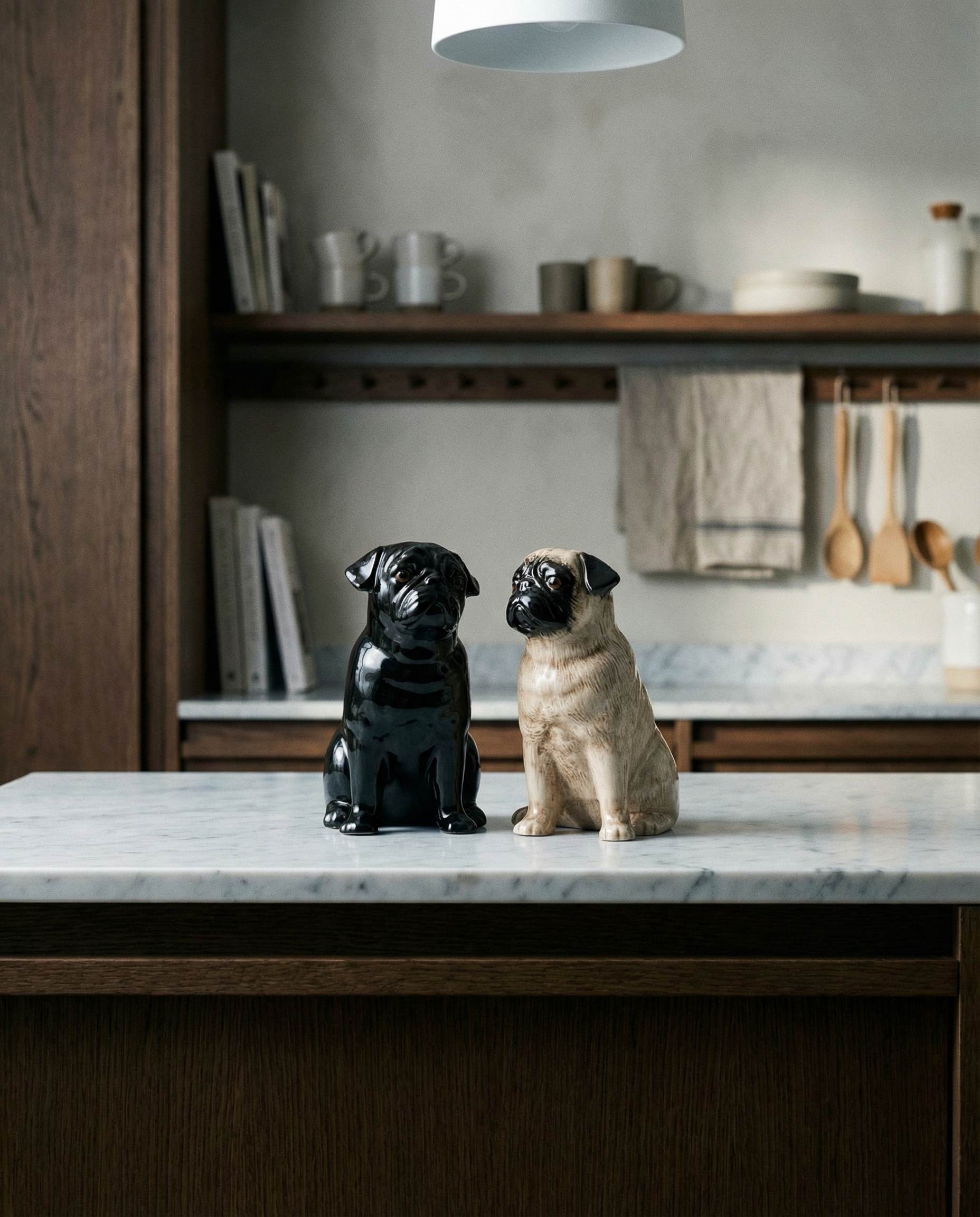 Encantador juego de salero y pimentero con forma de carlinos para una cocina acogedora