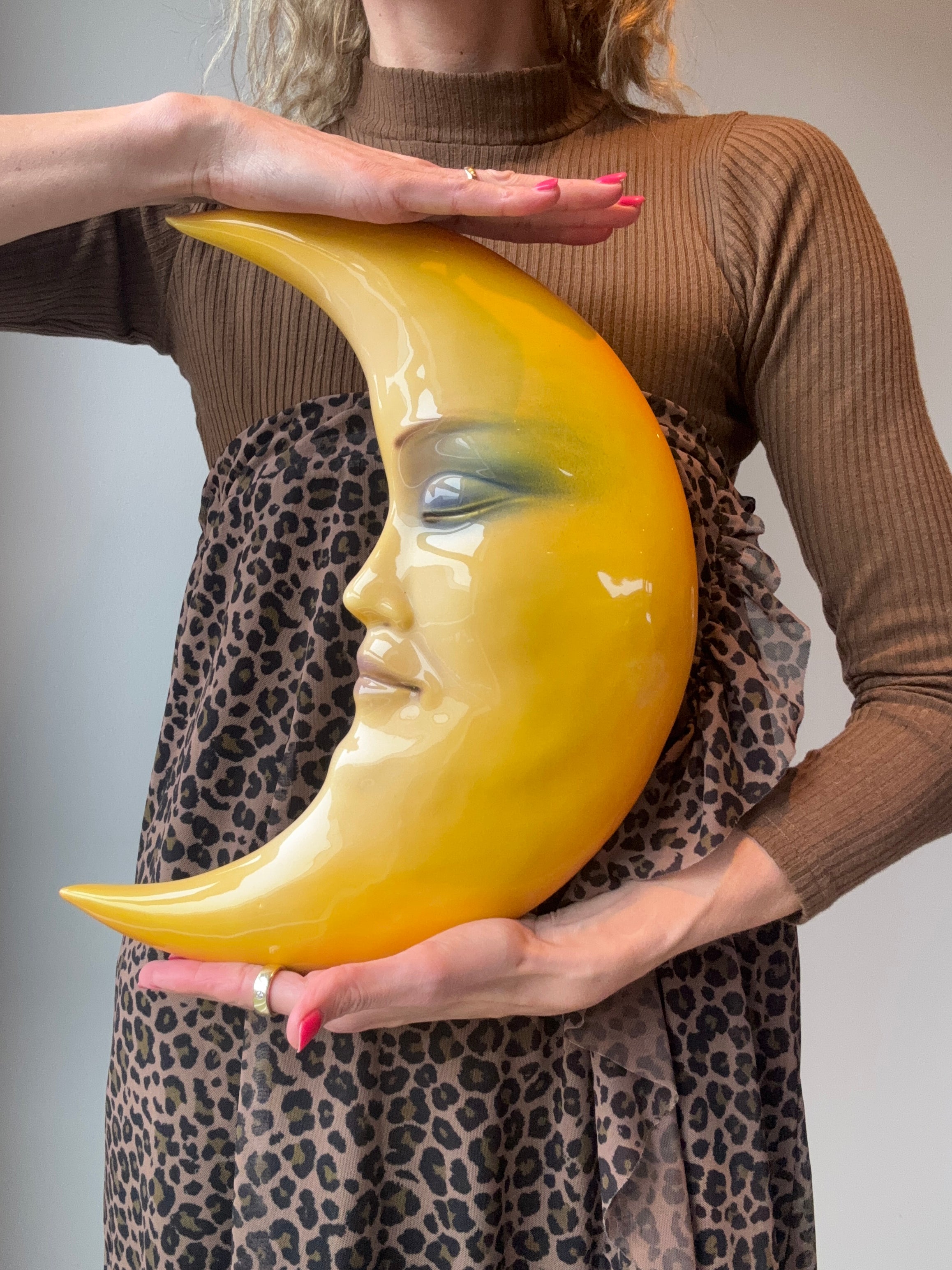 Tämä viehättävä seinäkoriste, joka on muotoiltu kuun muotoiseksi ja jolla on nukkuva ilme, on valmistettu Italiassa perheyrityksessä. Keraaminen hahmo on saatavana kauniissa keltaisissa ja oransseissa sävyissä, jotka tuovat lämpimän ja eloisan ilmeen mihin tahansa seinään. Jokainen kuu on käsinmaalattu, mikä antaa jokaiselle kappaleelle ainutlaatuisen ilmeen hienoine yksityiskohtineen kasvojen ilmeessä.
