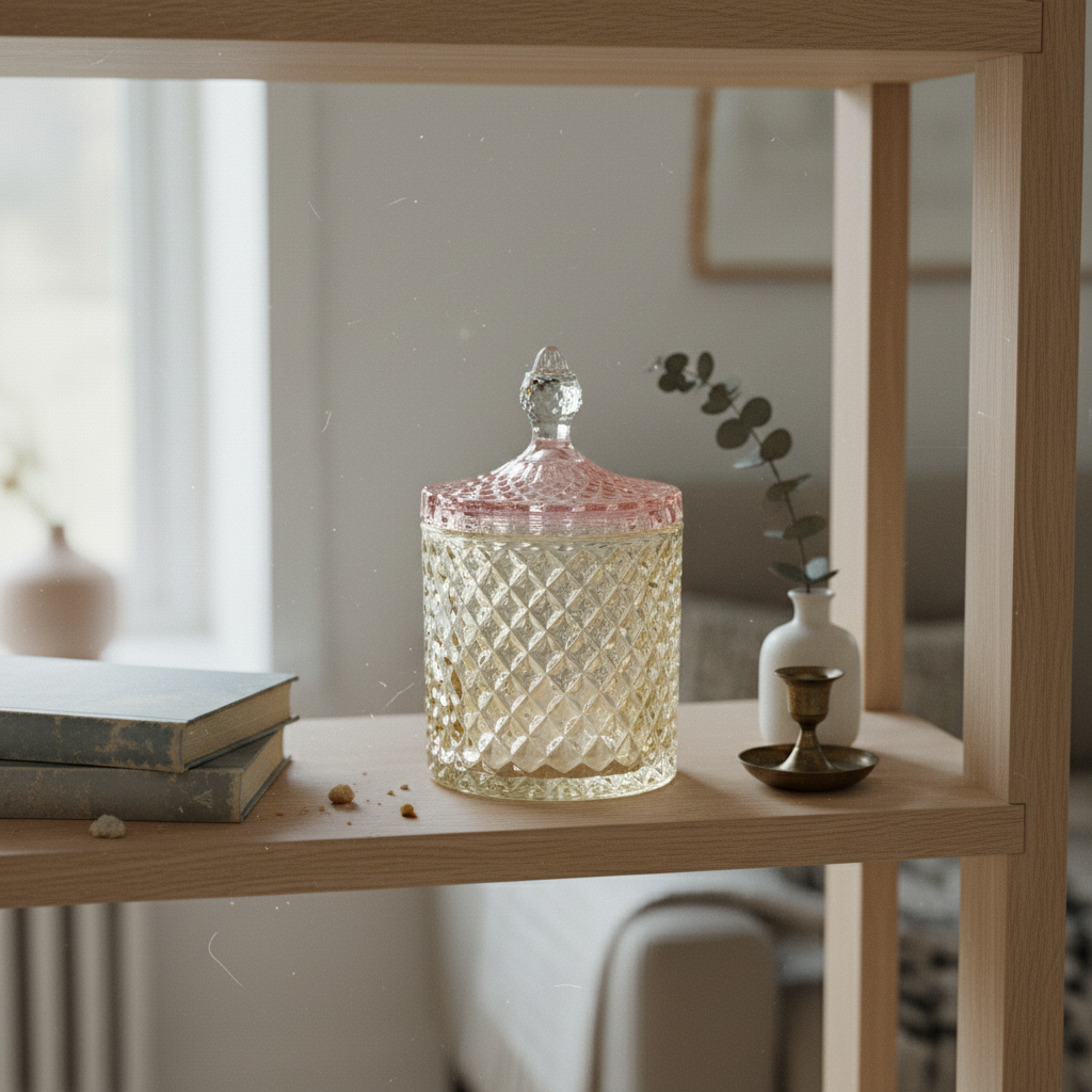 Il barattolo può essere utilizzato in diverse stanze della casa. In bagno è ideale per cotton fioc e piccoli articoli da toeletta, in cucina per spezie o biscotti, mentre in soggiorno o in camera da letto è perfetto per conservare gioielli o altri piccoli oggetti che meritano un posto decorativo.