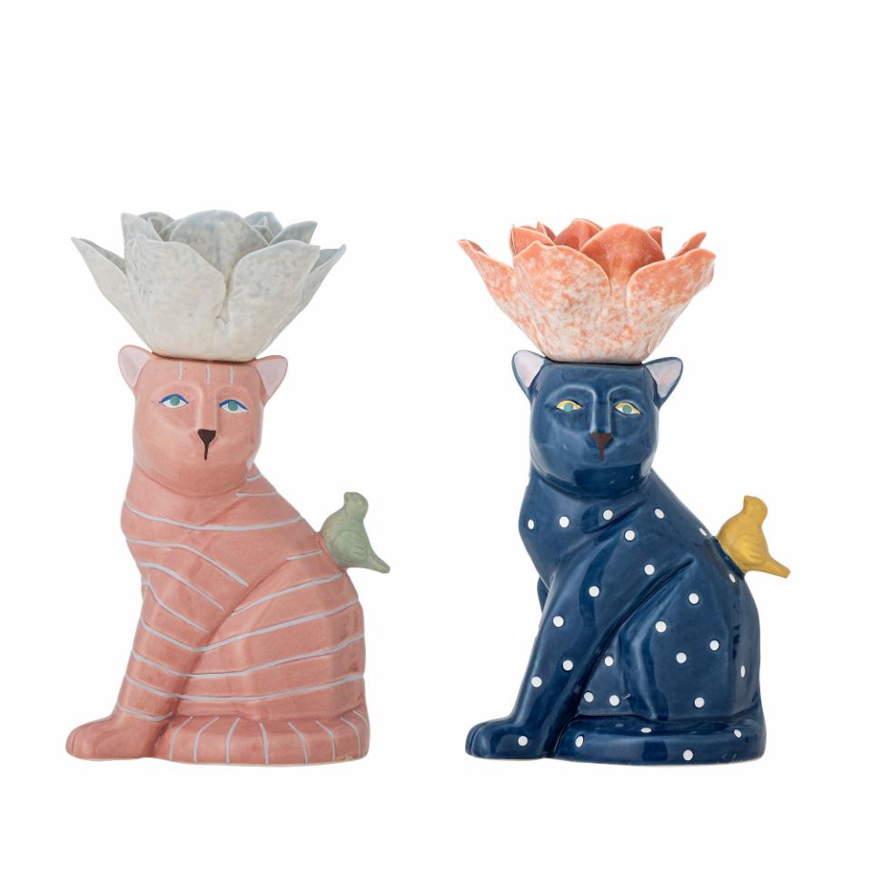 Disse unikke lysestager fra Bloomingville vil uden tvivl tilføje en charmerende detalje til dit hjem. Formet som katte med blomsterformede toppe og små fugledetaljer, er de ikke bare praktiske, men også dekorative. Hver lysestage er håndmalet og kommer med en reaktiv glasur, hvilket betyder at ingen stager er helt ens.