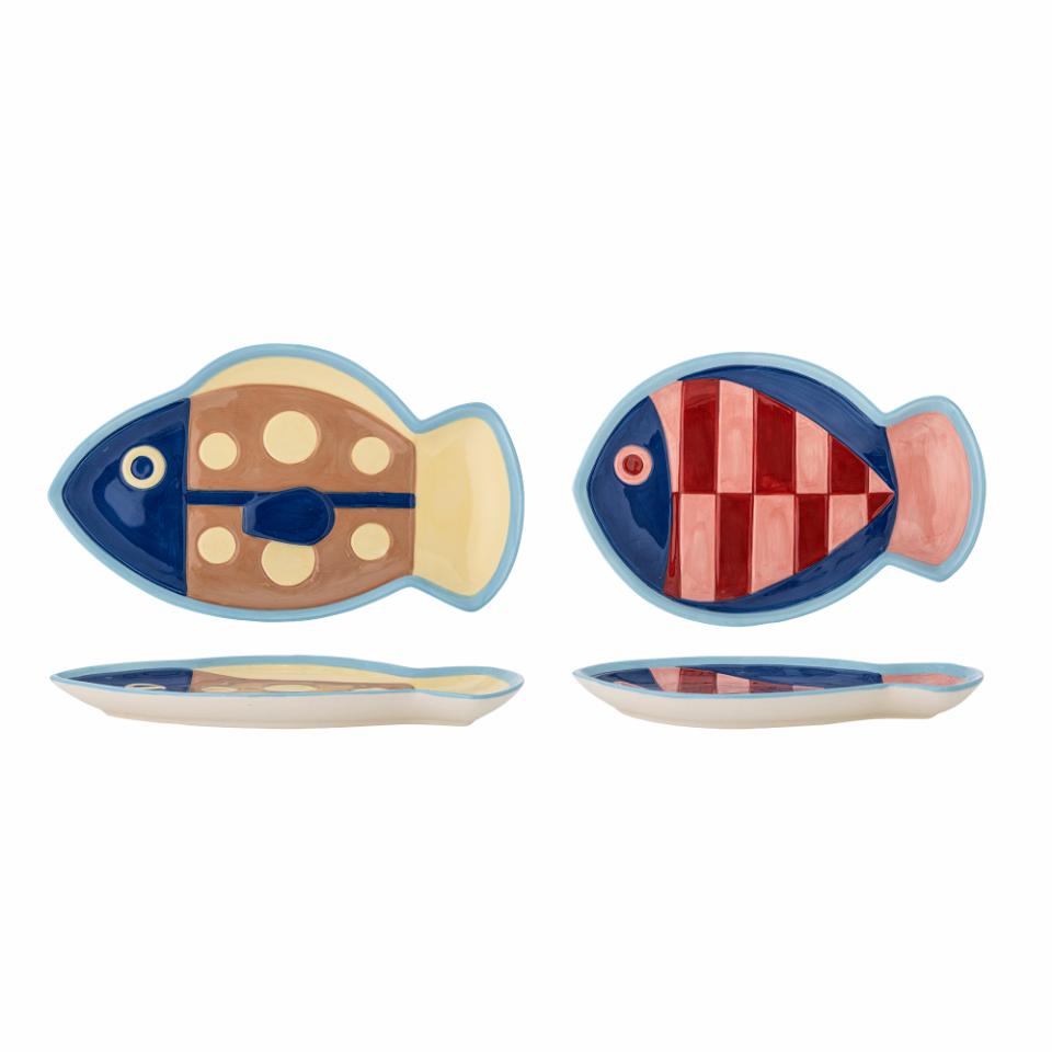 Bring a playful and maritime atmosphere to your table with these unique fish plates from Bloomingville. The set consists of two stoneware plates, each shaped like a fish. The painted surface is adorned with blue and warm tones, which, together with the embossed decoration, give a fine texture that makes the plates a beautiful eye-catcher.