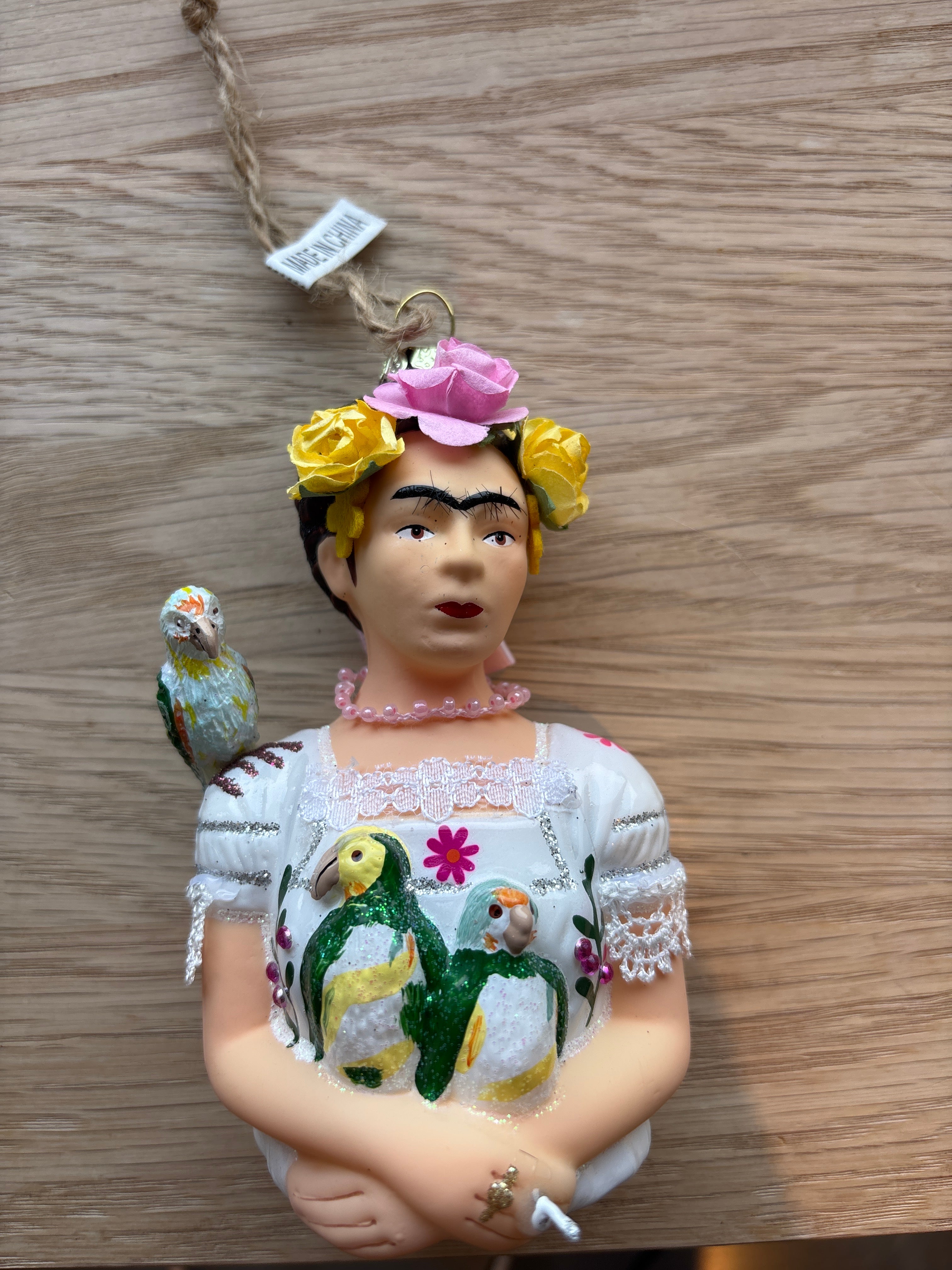 This colorful Frida Kahlo ornament with parrots is made of glass and measures 11.4 cm in height. The hand-painted artwork from Cody Foster is designed with inspiration from the world-famous Mexican artist and can be used both as a Christmas decoration and as an artistic detail in the home all year round.