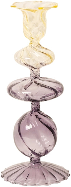 Denne glas lysestage fra Eja tilføjer et strejf af farve og charme til ethvert rum. Med sin lys gule og lys lilla nuance er den perfekt til at skabe en varm og indbydende atmosfære, uanset om det er til en hyggelig aften derhjemme eller en festlig lejlighed.