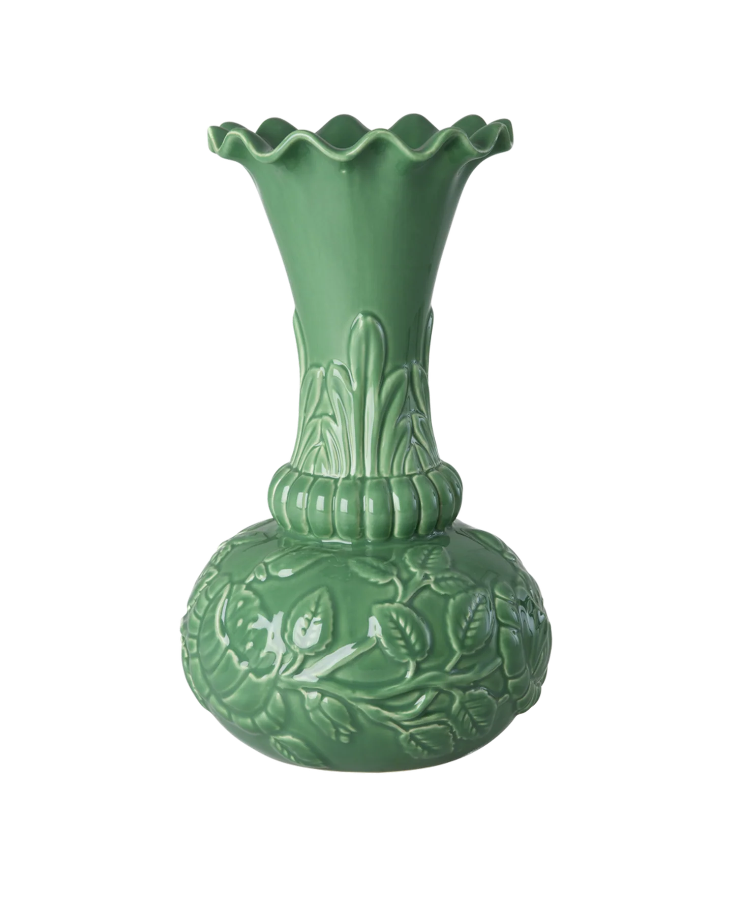 Tilføj et strejf af charme til dit interiør med denne skønne grønne keramik vase fra Rice. Den har et fint præget blomstermønster, der giver den et unikt og legende udtryk. Vasen er ideel til både friske og tørrede blomster, hvilket gør den til en alsidig tilføjelse til ethvert rum.