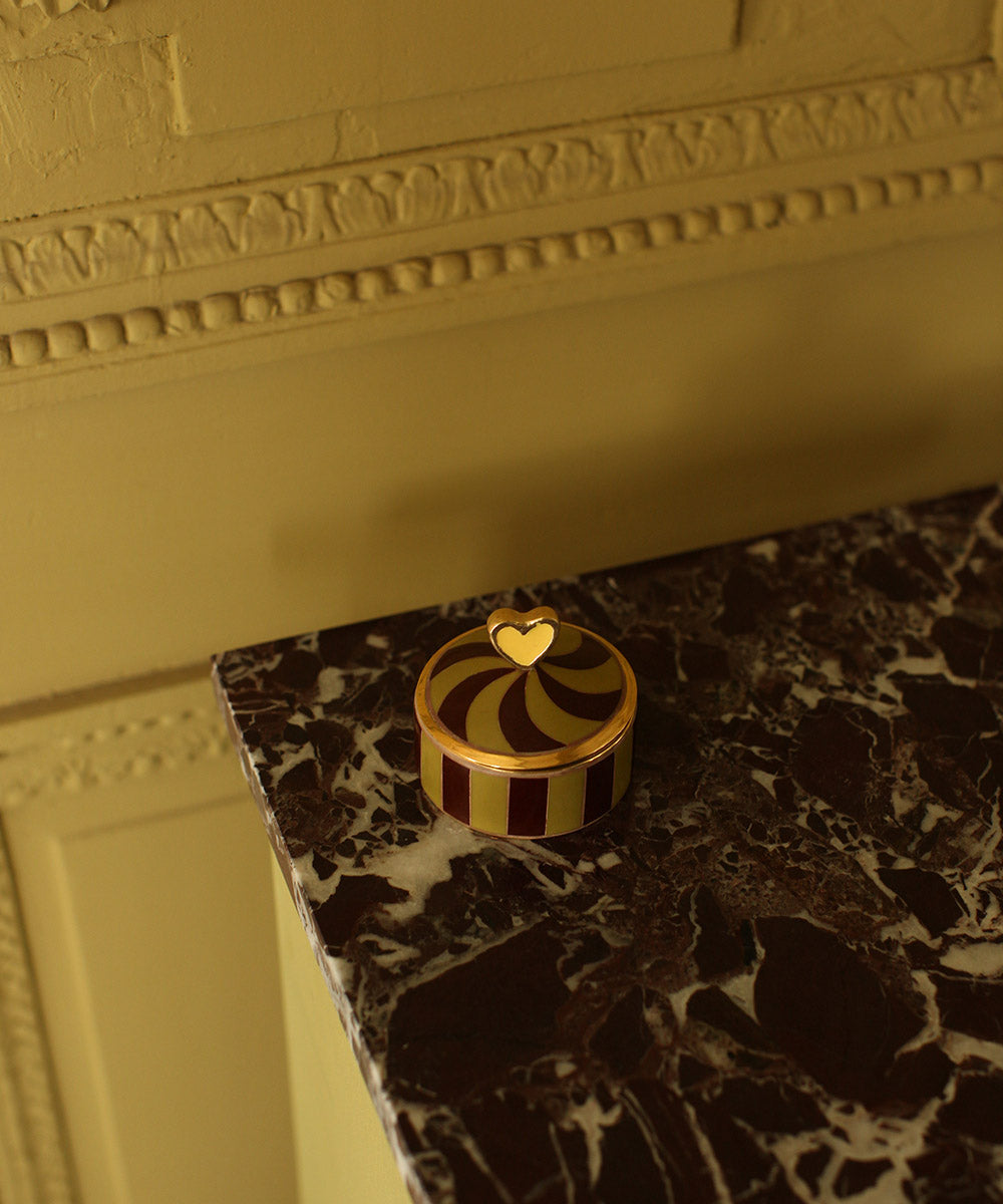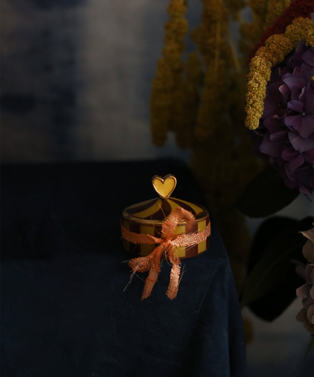 Pyar Circus krukken fra Doing Goods er ikke bare en opbevaringsboks; den er et kunstværk, der bringer glæde og farve ind i dit rum. Denne håndlavede krukke er lavet af 60% genanvendt messing og 40% harpiks, hvilket gør den både smuk og bæredygtig. Dens runde form, karakteristiske striber i gul og bordeaux samt den søde hjerteformede knap på låget giver den et unikt og livligt udtryk.