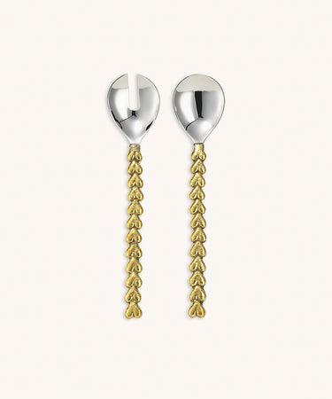 Hjerte salatbestik fra Doing Goods er det perfekte valg til dem, der ønsker at gøre enhver salatpræsentation til en fest. Dette smukke sæt indeholder en salatske og en salatgaffel, begge med elegante håndtag dekoreret med en række delikate gyldne hjerter. Hver del er håndlavet af genanvendt messing og rustfrit stål af høj kvalitet, hvilket gør dem til ægte blikfang ved enhver lejlighed.