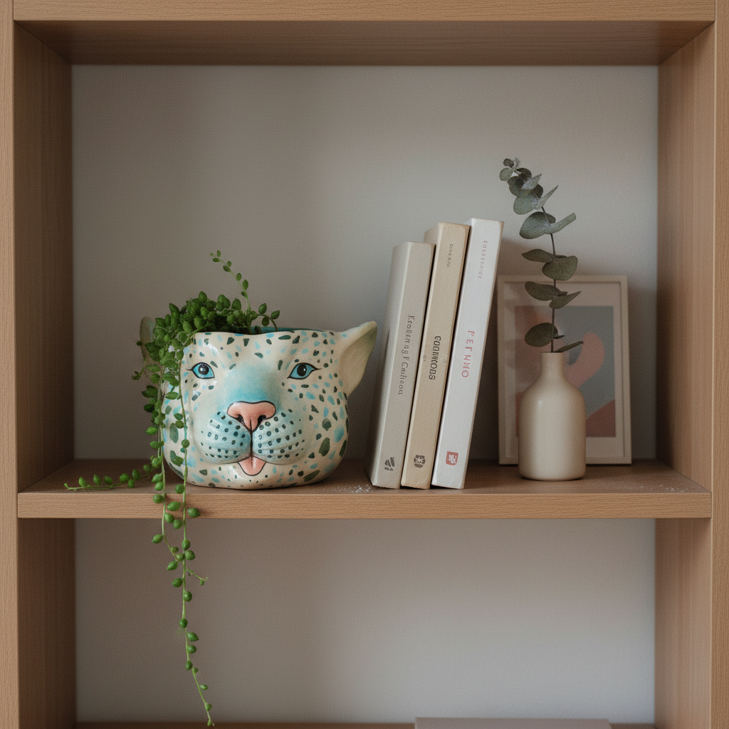 This elegant leopard plant pot cover in stoneware is hand-painted with beautiful green and mint shades, giving it a natural and personal look. With its compact dimensions of 10 x 14 cm, it is perfect for smaller plants and can be easily integrated into various interior styles.