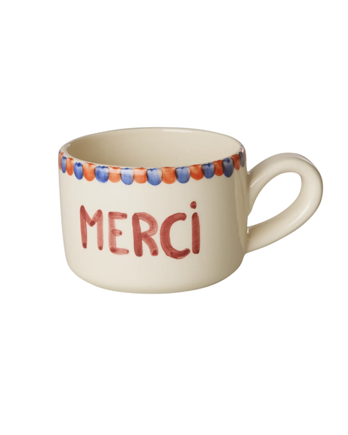 Denne skønne Merci kop fra RICE tilføjer et personligt præg til din kaffetid. Med sine søde prikker på kanten og ordet ""merci"" malet i midten, er hver kop et kunstværk i sig selv, håndmalet af talentfulde portugisiske kvinder, hvilket gør hver enkelt kop unik.