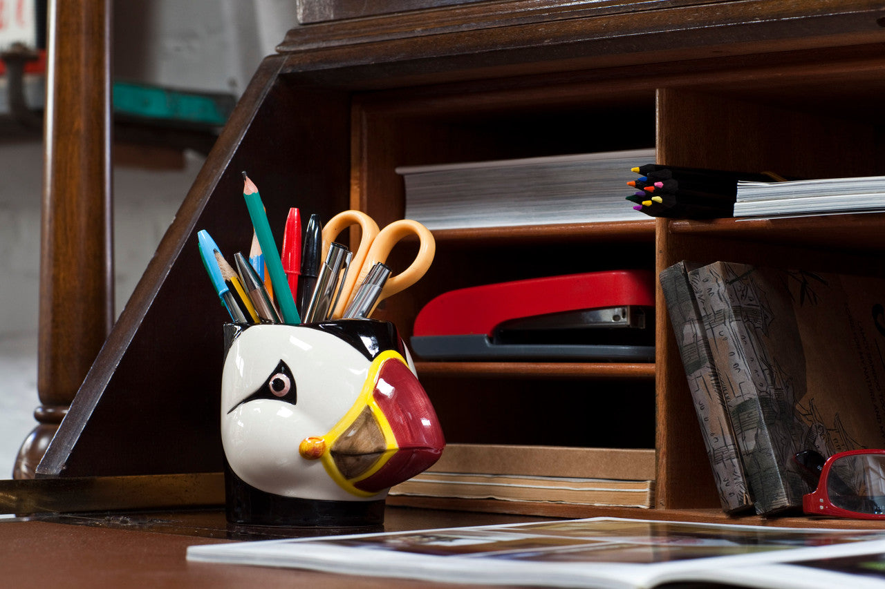 Vasens alsidige design gør den velegnet til forskellige formål i hjemmet. Brug den som en traditionel vase til små blomsterbuketter, som en praktisk holder til blyanter, pensler eller tandbørster på skrivebordet eller i badeværelset. Det charmerende søpapegøjemotiv tilfører personlighed til enhver placering.