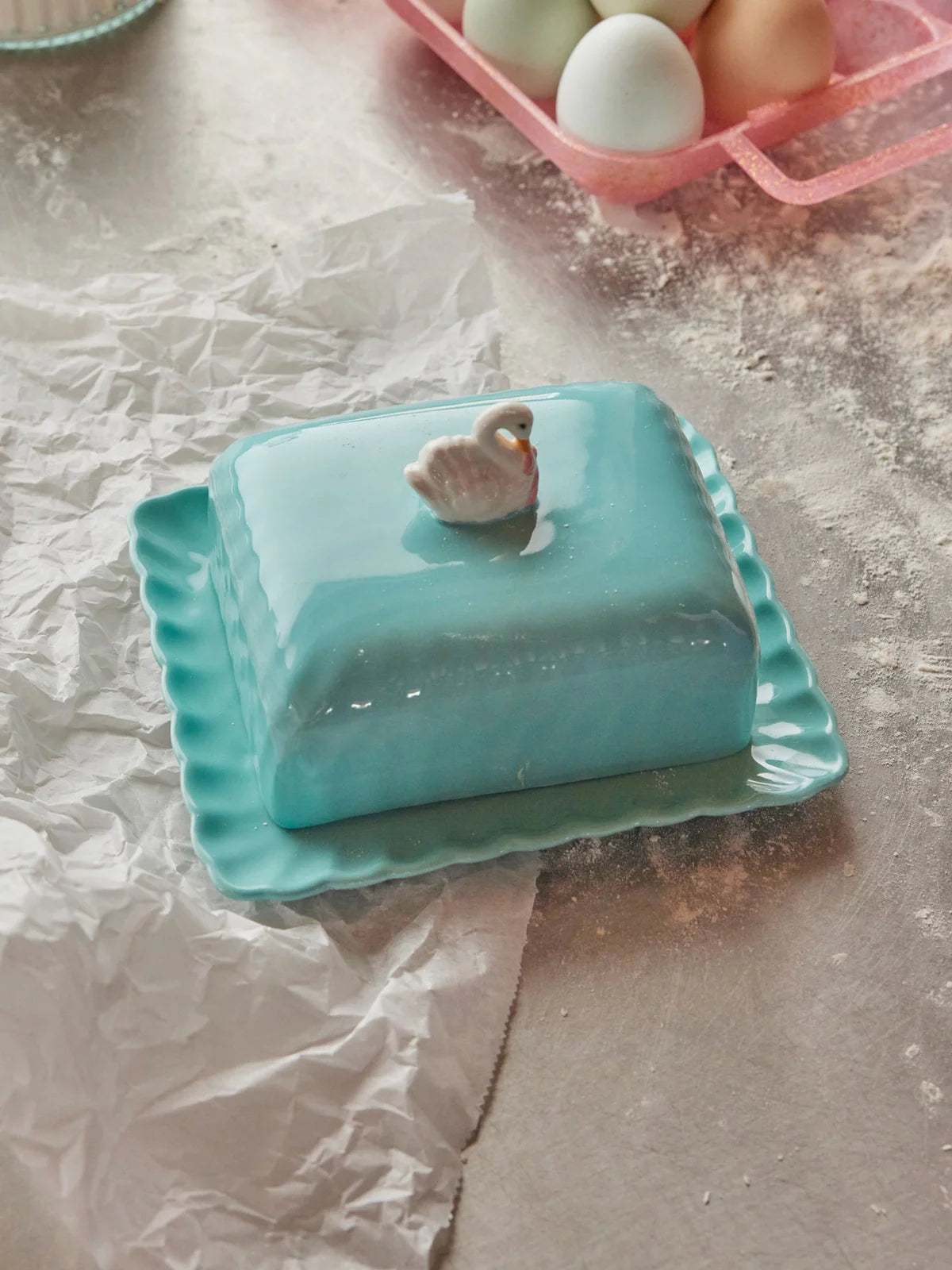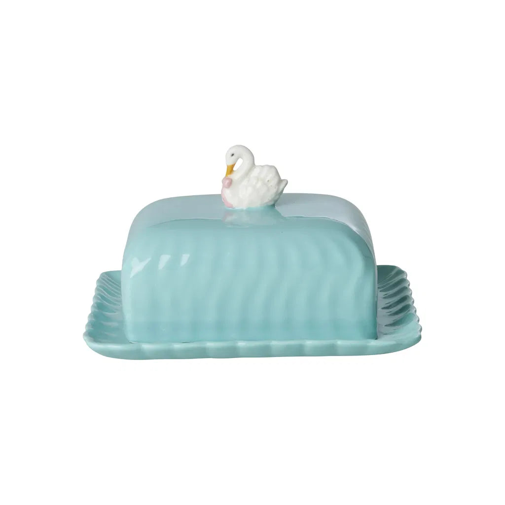 With this ceramic butter dish from Rice, you can add a colorful and playful element to your breakfast table. The mint-colored bowl is adorned with a charming wave design and a cute lid decorated with a swan wearing a pink bow. This butter dish is not only practical, but also a decorative part of your table setting.