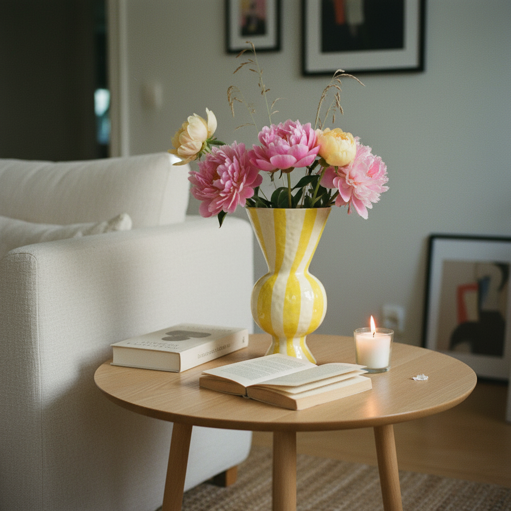 Culoarea galben strălucitor adaugă energie și căldură oricărei camere. Designul geometric al vazei oferă un contrast interesant atât cu stilurile de interior minimaliste, cât și cu cele mai expresive, făcând-o versatilă și ușor de integrat în diferite medii de locuit.