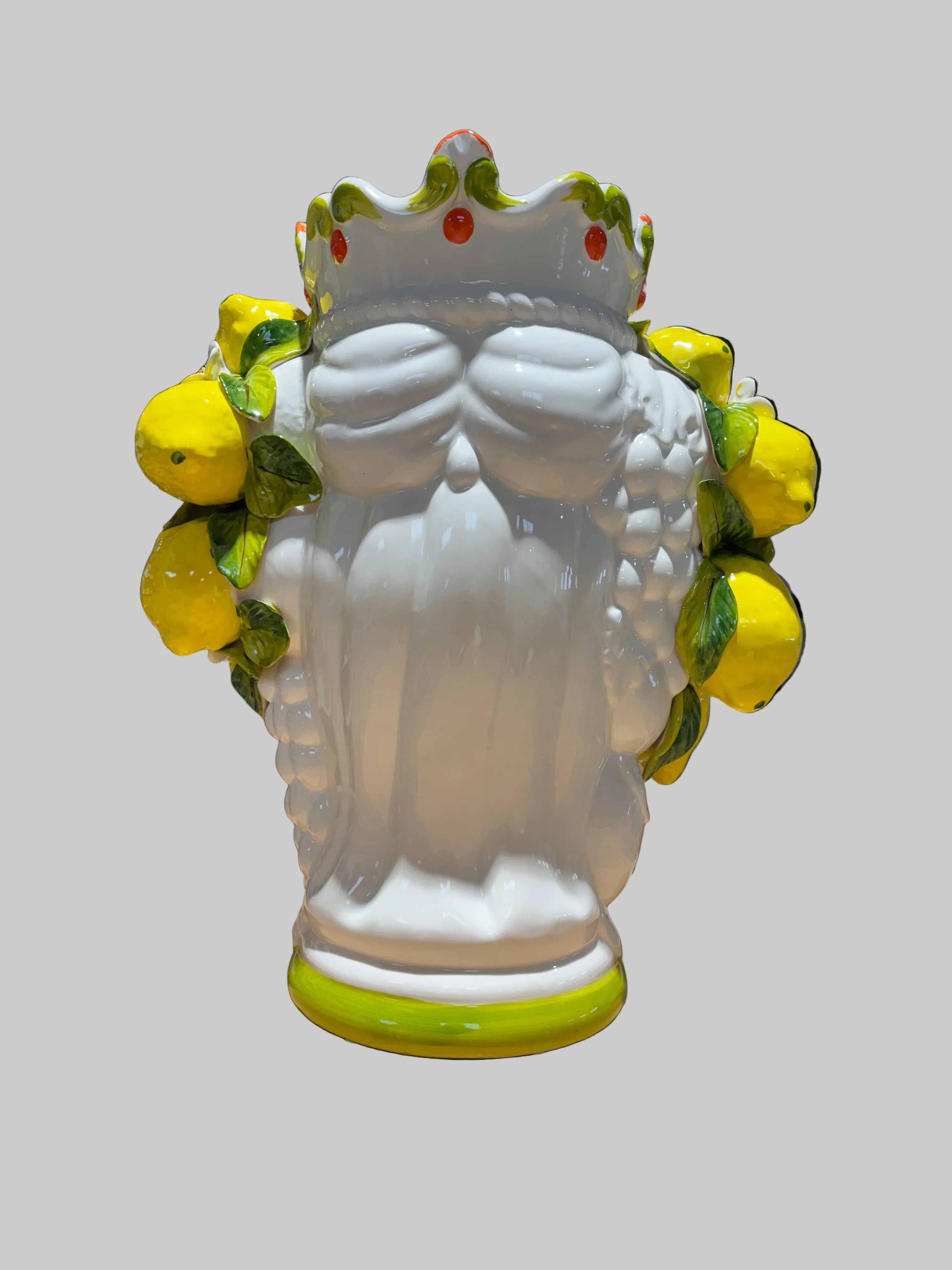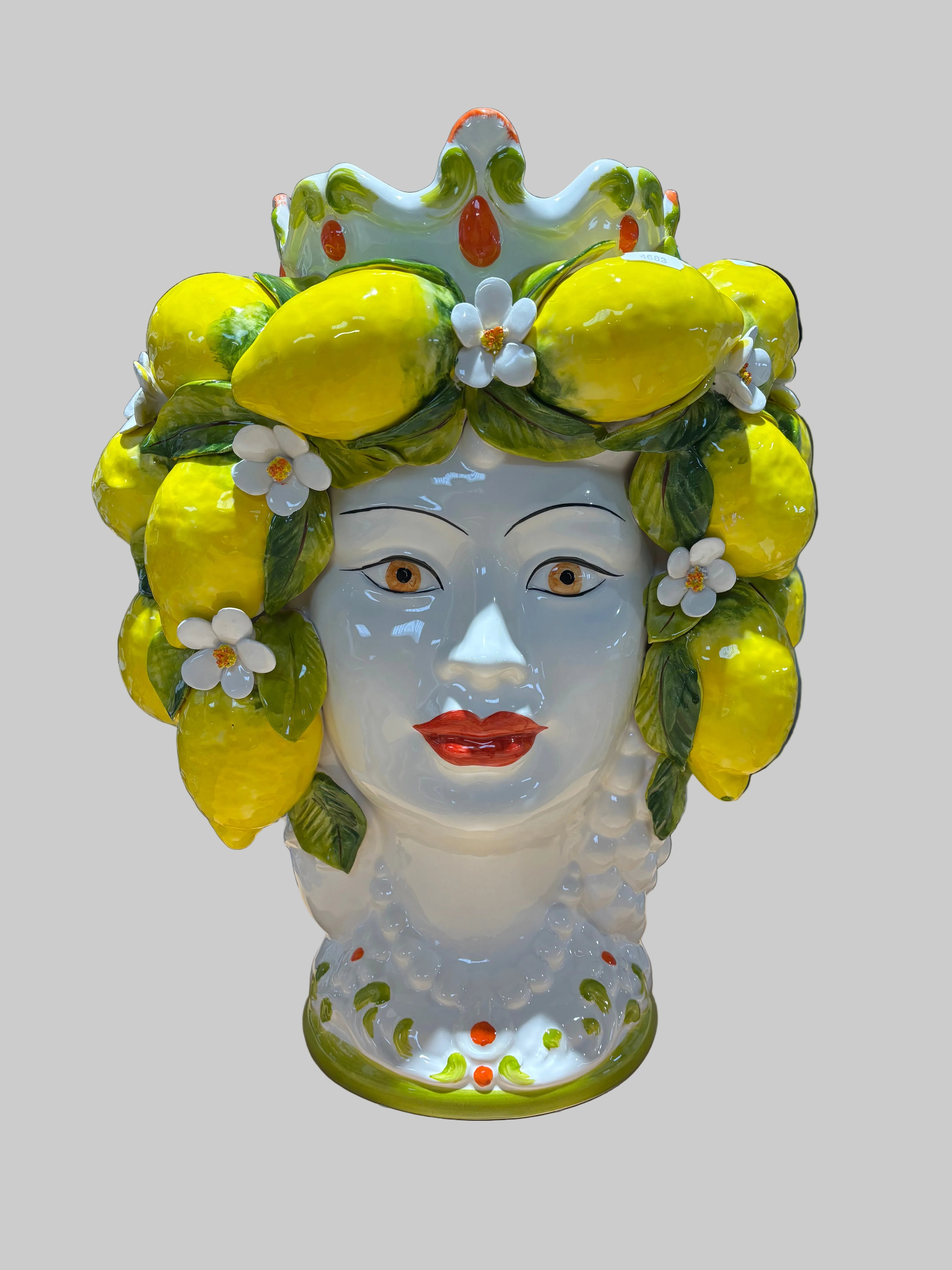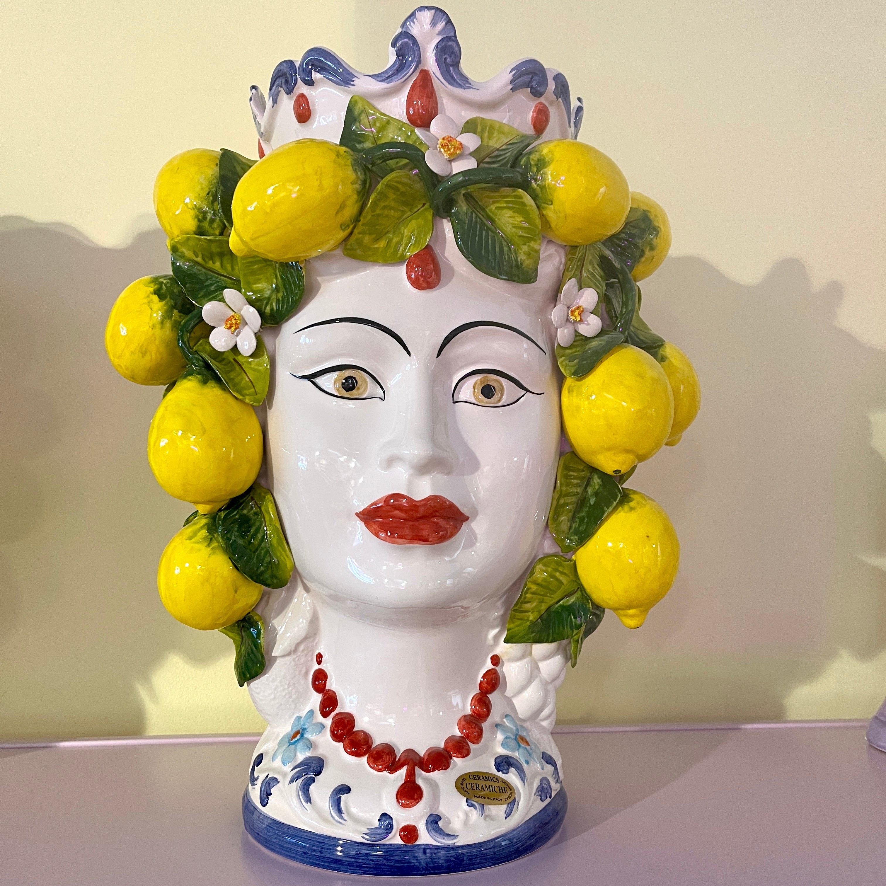 Această vază Testa Di Moro, înaltă de 45 cm, reprezintă o tradiție siciliană autentică, cu o mare valoare istorică și artistică. Realizată manual de o companie familială de a doua și a treia generație, vaza înfățișează o femeie frumoasă, decorată cu lămâi pictate manual și detalii florale fine, adăugând un plus de stil italian casei.